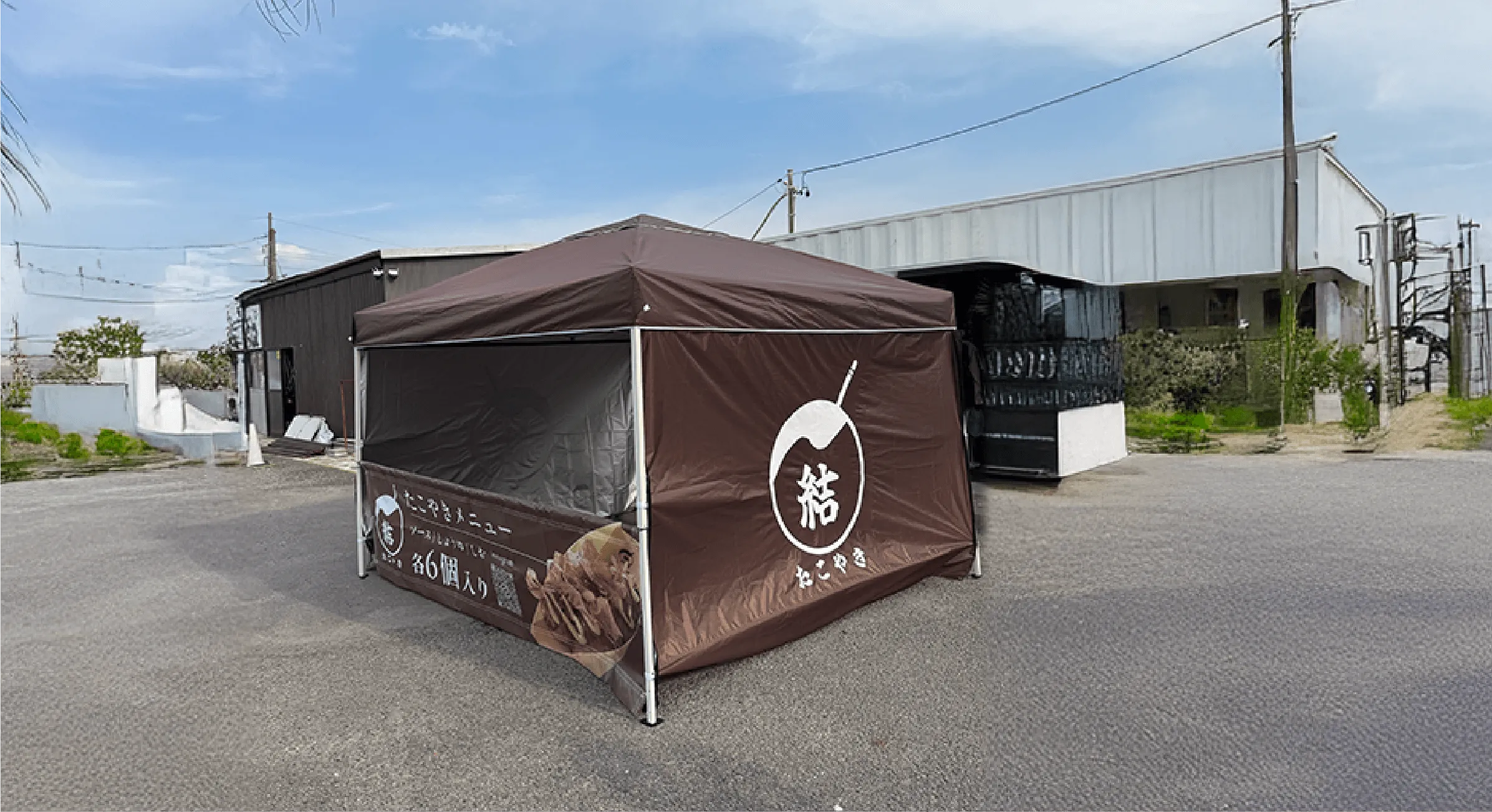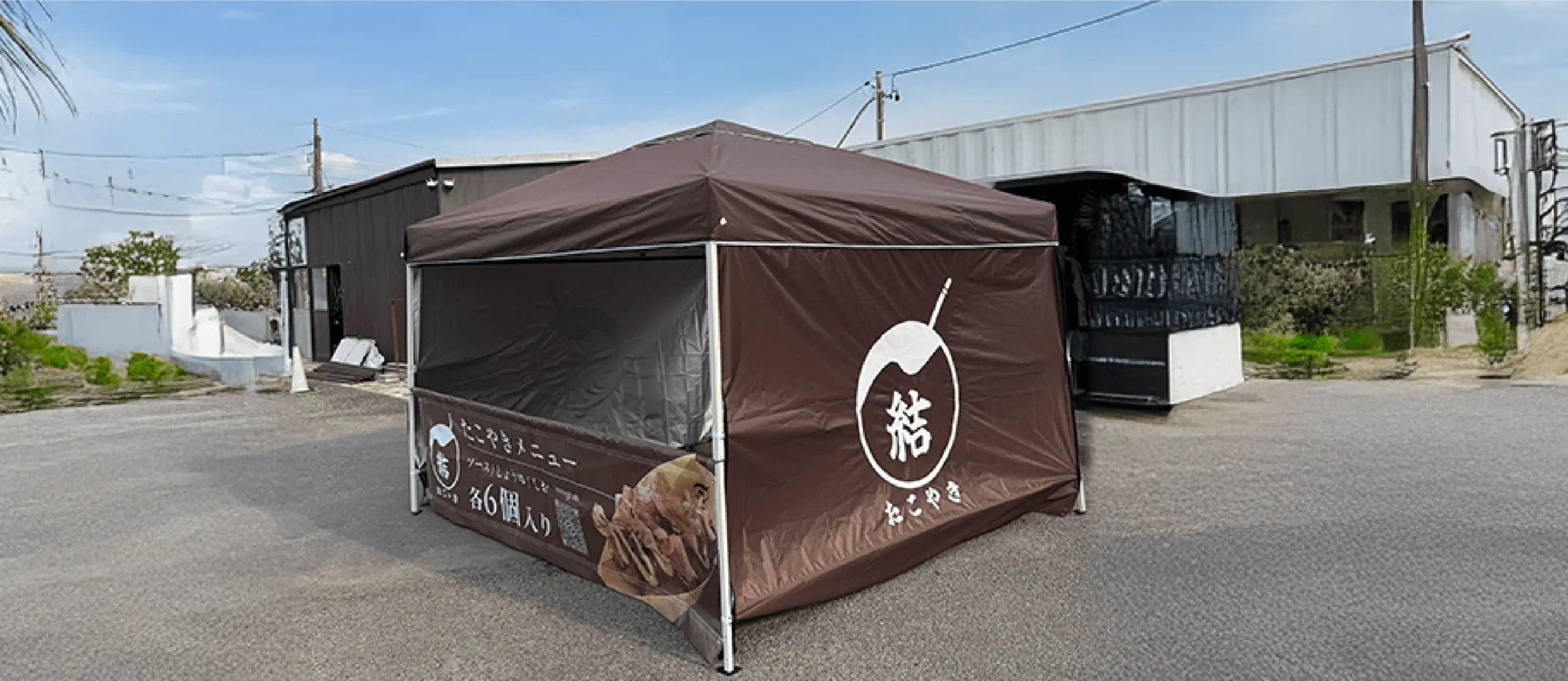 岐阜県白川郷を拠点とする、たこ焼き 結様のテントデザインを担当させていただきました。ブラウンを基調としたカラーリングにより、落ち着きと温もりを感じさせる世界観を演出。大きく配置したロゴは視認性を高めると同時に、シンプルながらもしっかりとブランドの印象を残します。 側面には商品写真と情報をバランスよく配置し、通りがかりでも自然と興味を引き、購買意欲へとつなげる設計に。屋外での使用を前提に、遠くからでも伝わる分かりやすさと、近くで見たときの丁寧さを両立させています。 親しみやすさと存在感を兼ね備えた、“立ち寄りたくなる”テントに仕上げました。