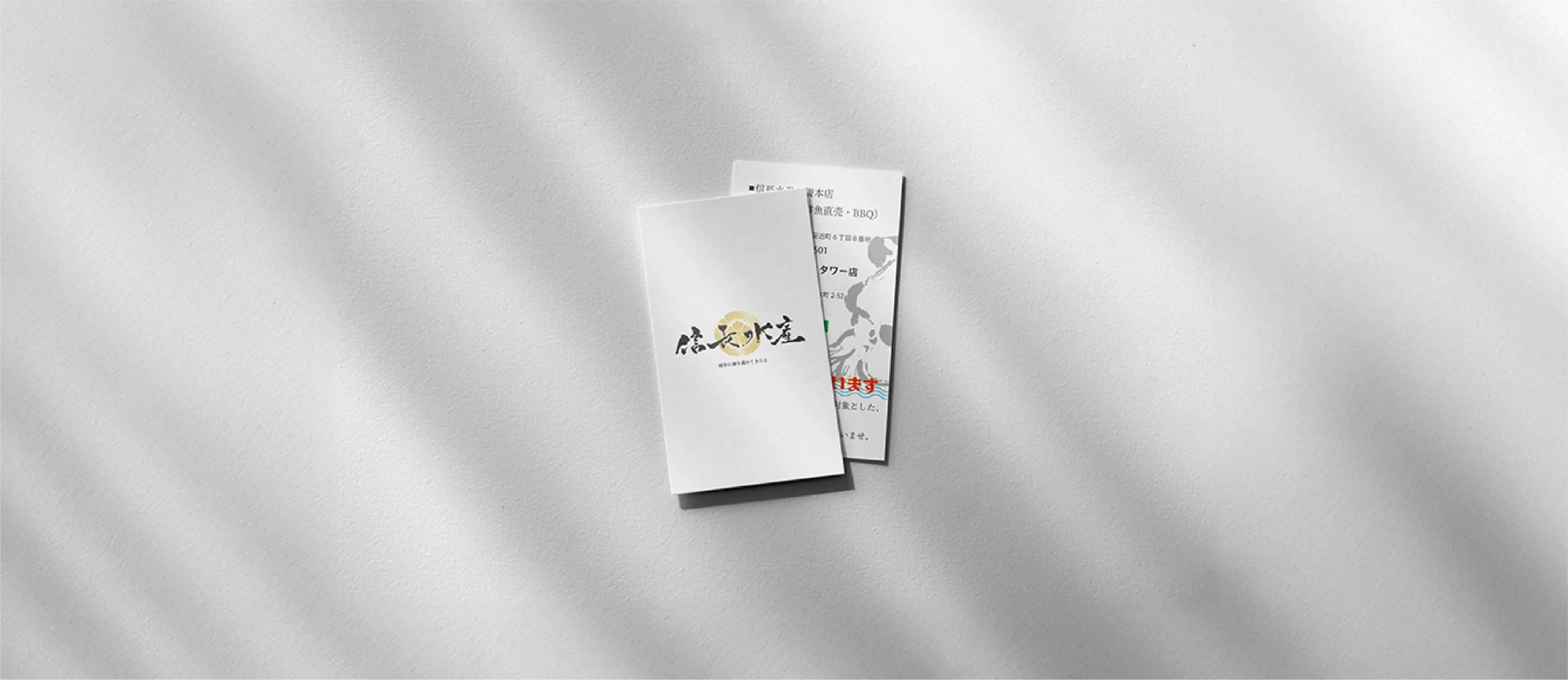 岐阜県羽島市にある信長水産様のショップカードデザインを制作させていただきました。ロゴの印象を活かし、シンプルで分かりやすい構成を意識。必要な情報がすっと伝わる、見やすさを大切にしたデザインに仕上げさせていただきました。