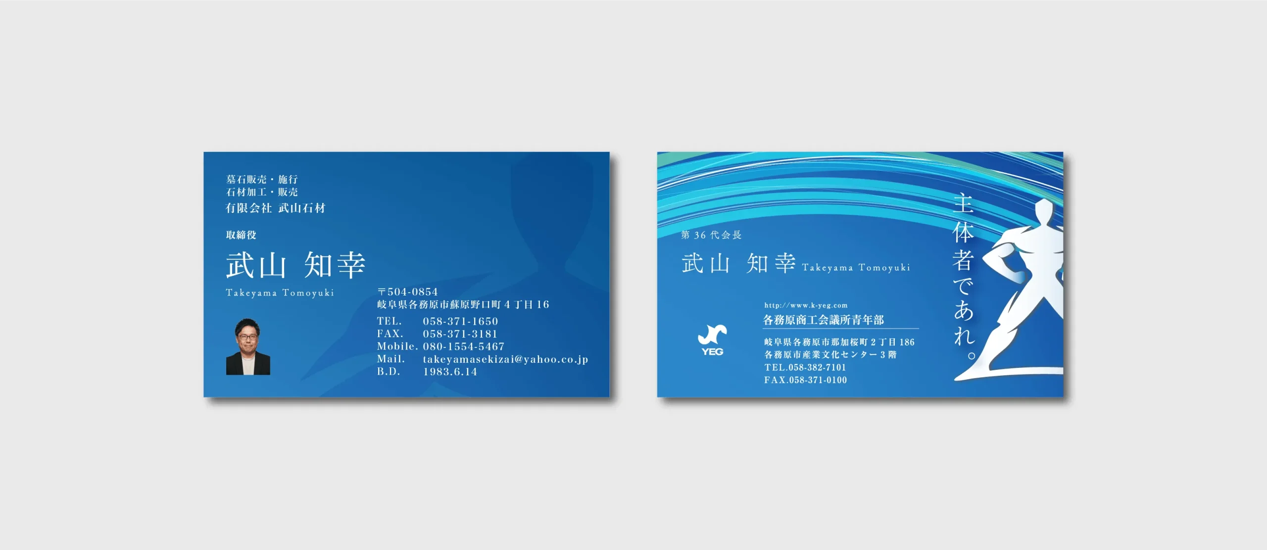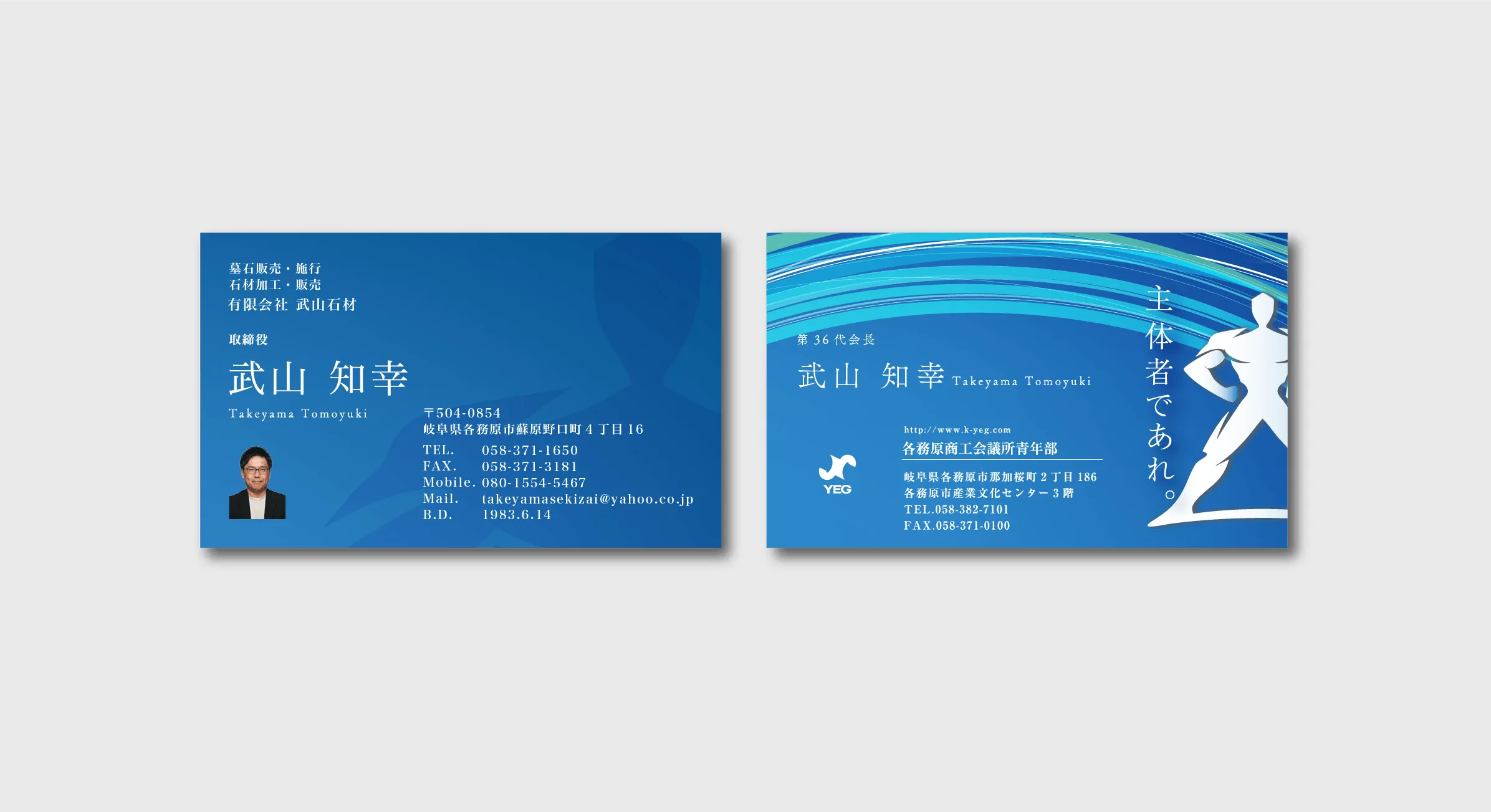 各務原商工会議所青年部 様の名刺を制作させていただきました。ブルーを基調としたデザインで、信頼感と先進性を感じさせる仕上がりに。躍動感のあるグラフィックとシルエットを取り入れ、各務原商工会議所青年部の一員として、それぞれが主体者であることを印象付けるデザインに仕上げています。