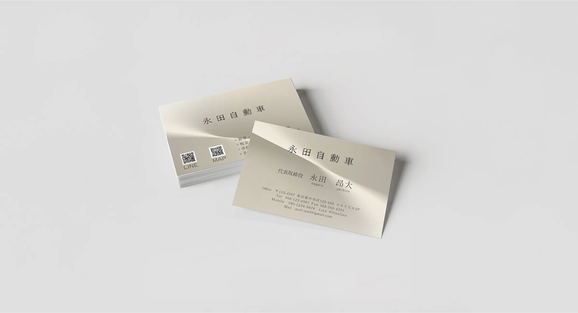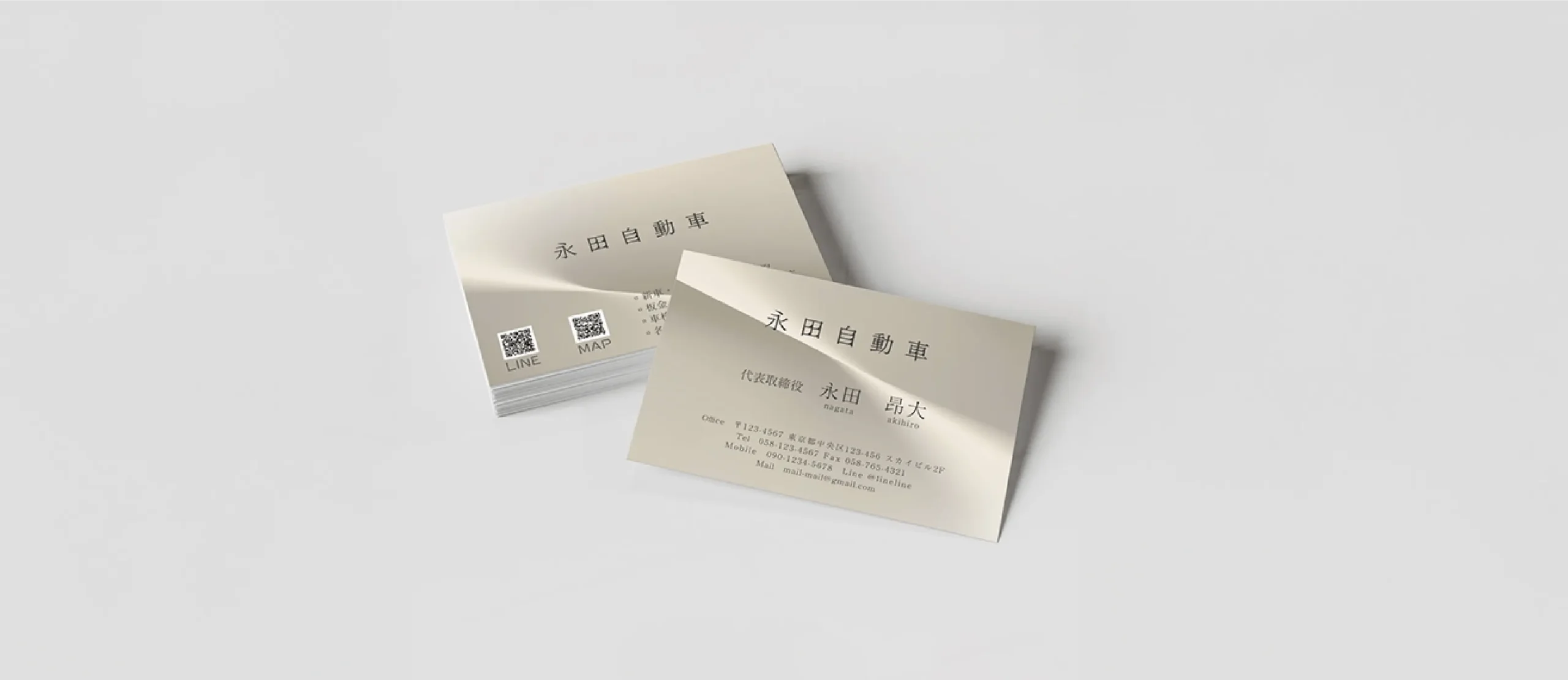 岐阜県で自動車業を営む株式会社永田自動車様 の名刺を制作させていただきました。上品なカラーリングを基調に、シンプルで上品なデザインに仕上げています。 中央の光沢表現がアクセントとなり、洗練された印象を与える名刺デザインです。裏面にはLINEやMAPのQRコードを配置し、スムーズにお問い合わせや来店につながる構成にしています。シンプルながらも存在感のあるビジネスカードです。