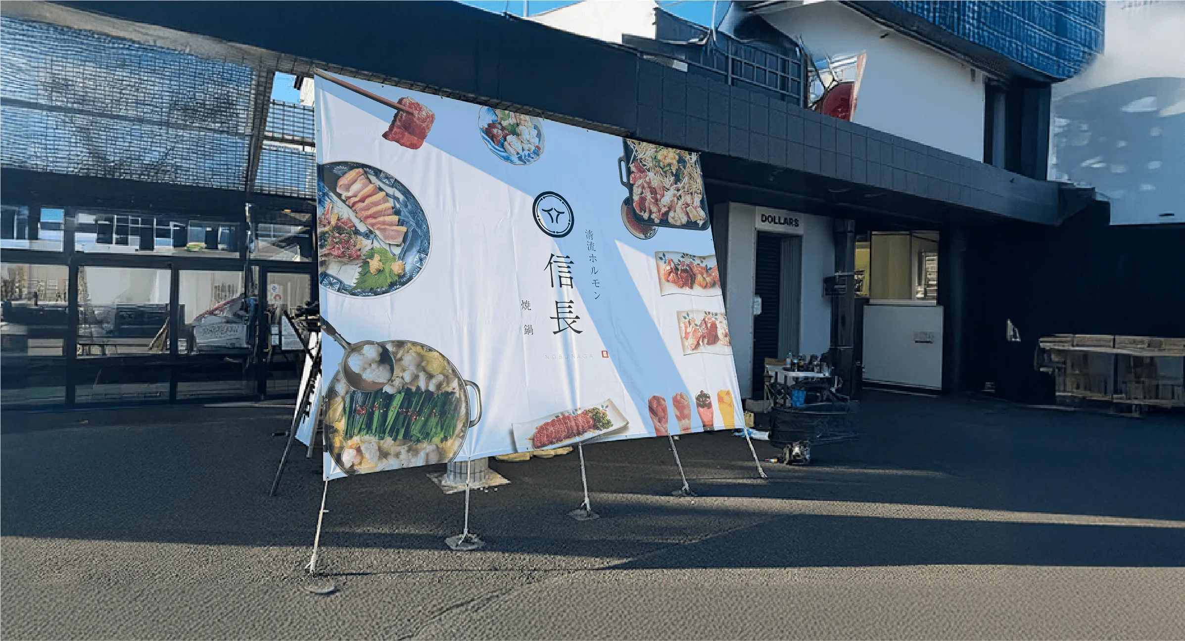 岐阜県で飲食事業を展開されている清流ホルモン信長 様のターポリンデザインを担当させていただきました。ダイナミックに配置した料理写真と、余白を活かしたレイアウトによって、視認性と訴求力を両立。遠目からでも一目で“美味しさ”が伝わる構成に仕上げています。中央に据えた縦組みのロゴが全体を引き締め、ブランドとしての存在感を強調。さらに、視線の流れを意識したビジュアル配置により、自然と情報へ誘導する設計としています。屋外での使用を前提に、インパクトと品のバランスを整えた、“足を止めさせる”ターポリンに仕上げさせていただきました。