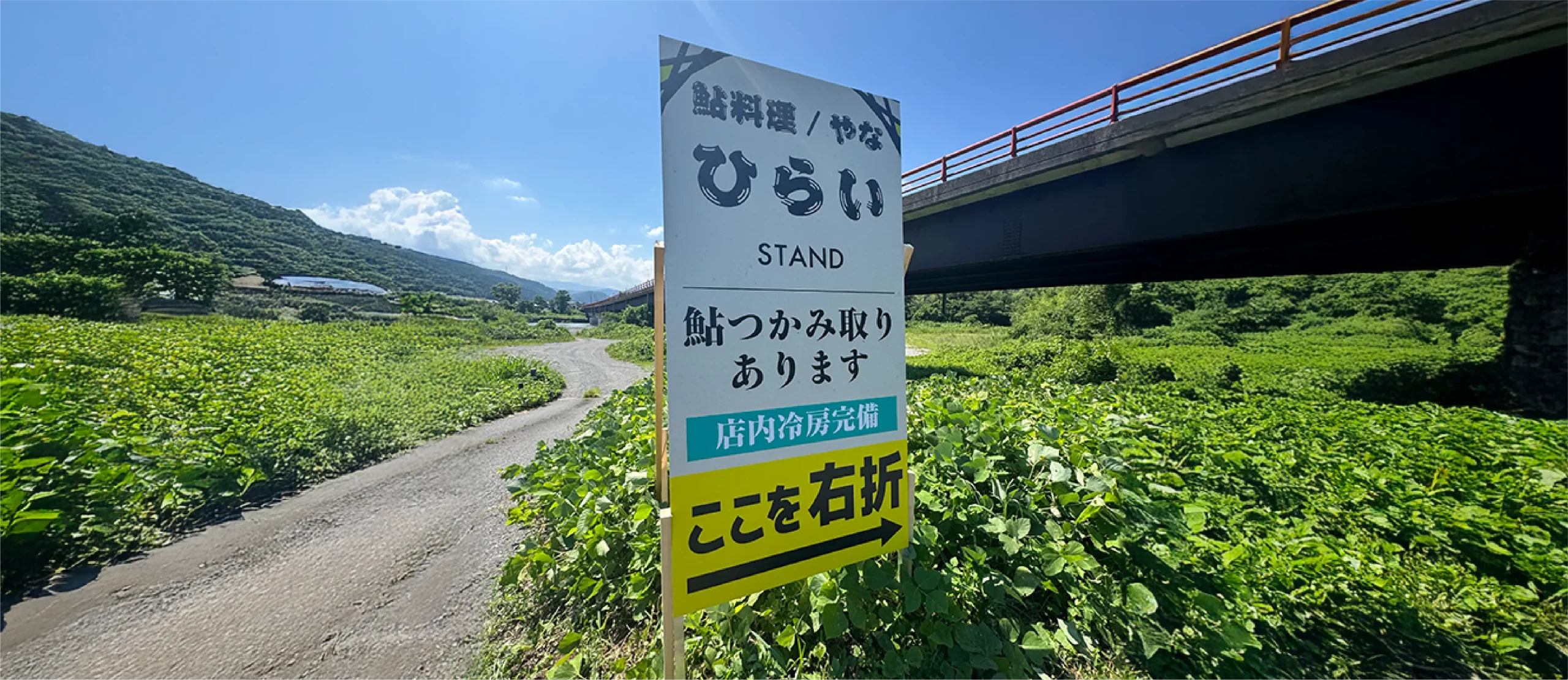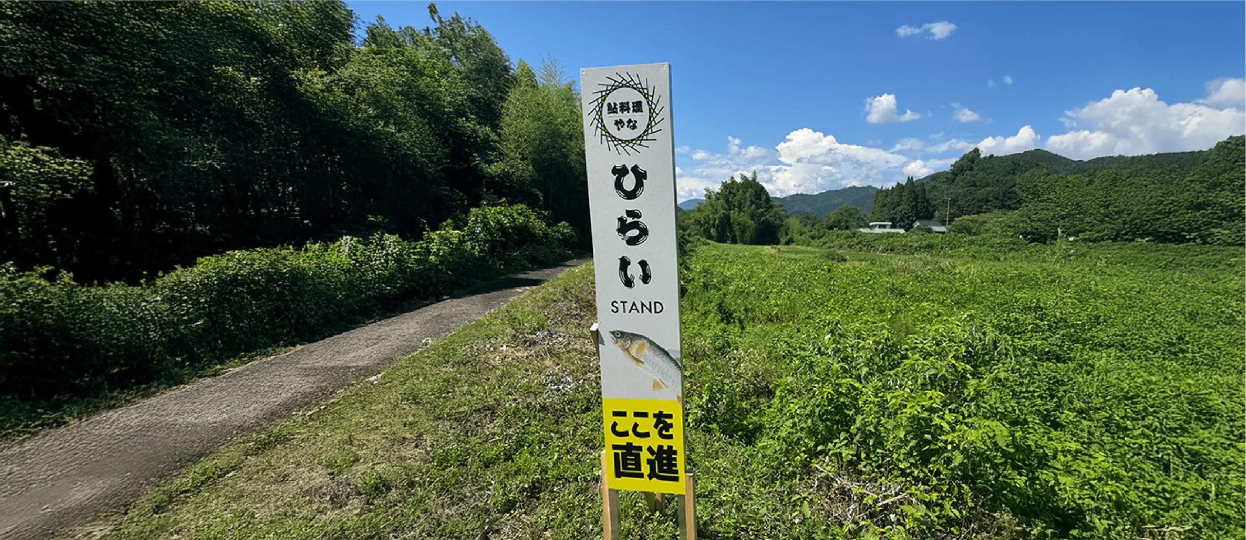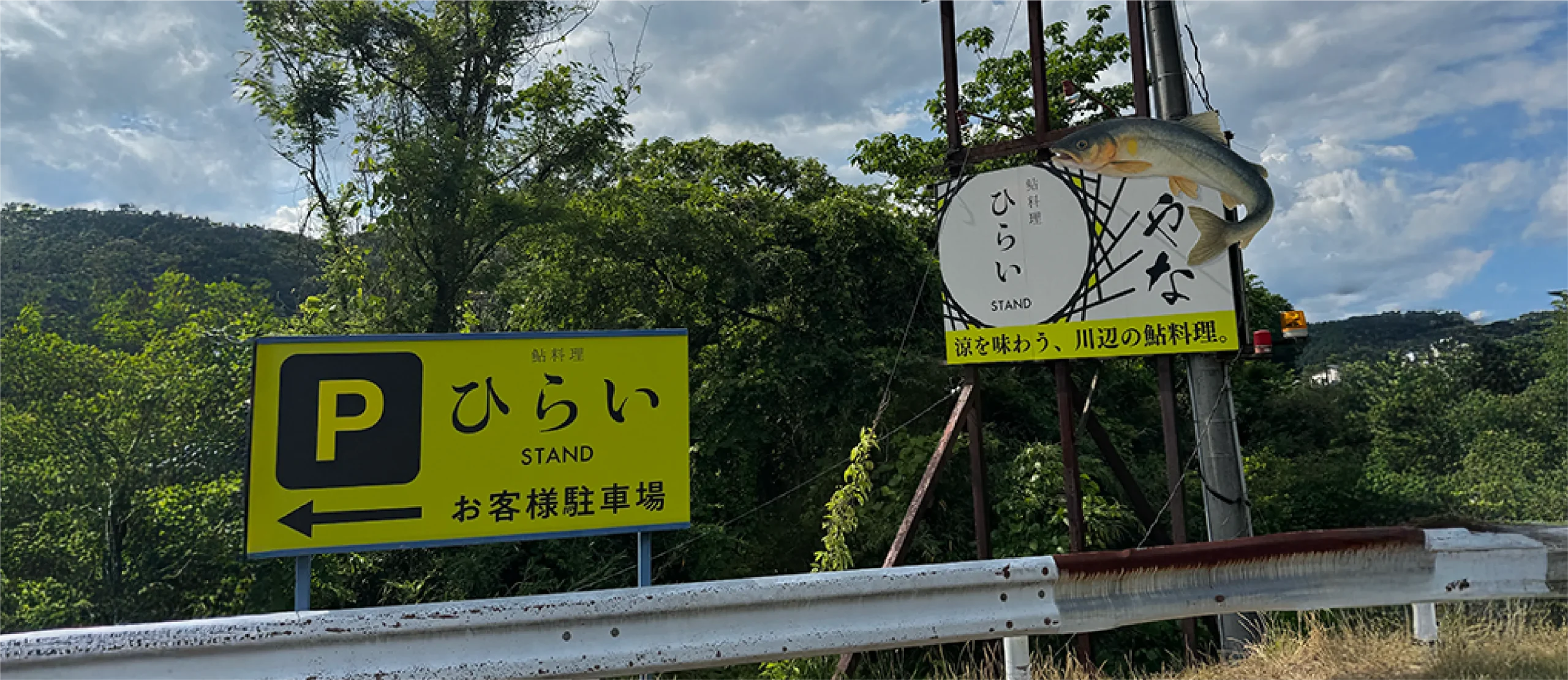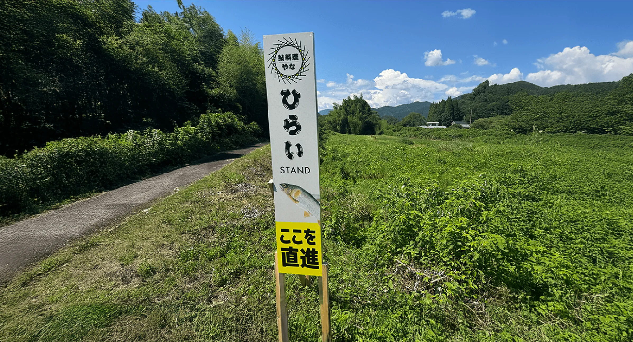 岐阜県本巣市にある鮎料理 ひらい 様の野立て看板のデザインを担当させていただきました。自然豊かなロケーションの中でもしっかりと目を引くよう、シンプルで視認性の高いレイアウトに設計。ブランドの象徴である鮎のビジュアルを取り入れ、遠くからでも印象に残るサインデザインに仕上げています。誘導サインとしての役割を持たせながら、ひらい様の世界観をそのまま感じられる看板となっています。