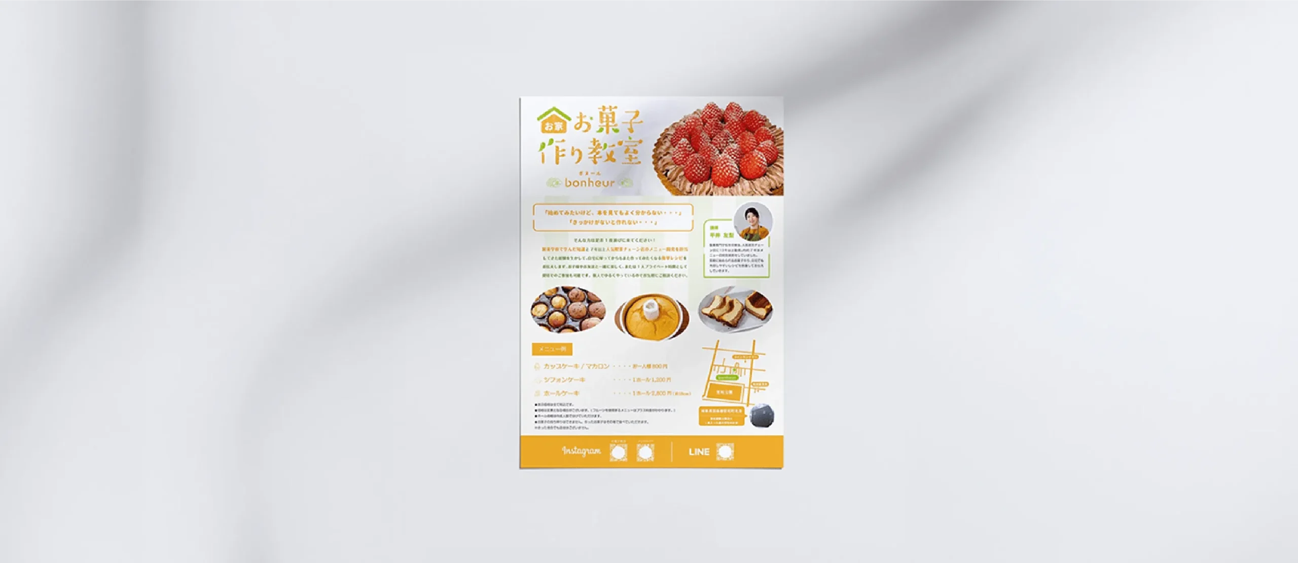お菓子作り教室「bonheur(ボヌール)」様のチラシデザインを担当させていただきました。やさしく温かみのあるデザインをベースに、教室の雰囲気や楽しさが伝わるビジュアルに仕上げています。 写真やレイアウトにもこだわり、初めての方でも安心して参加したくなるチラシデザインを意識して制作させていただきました。