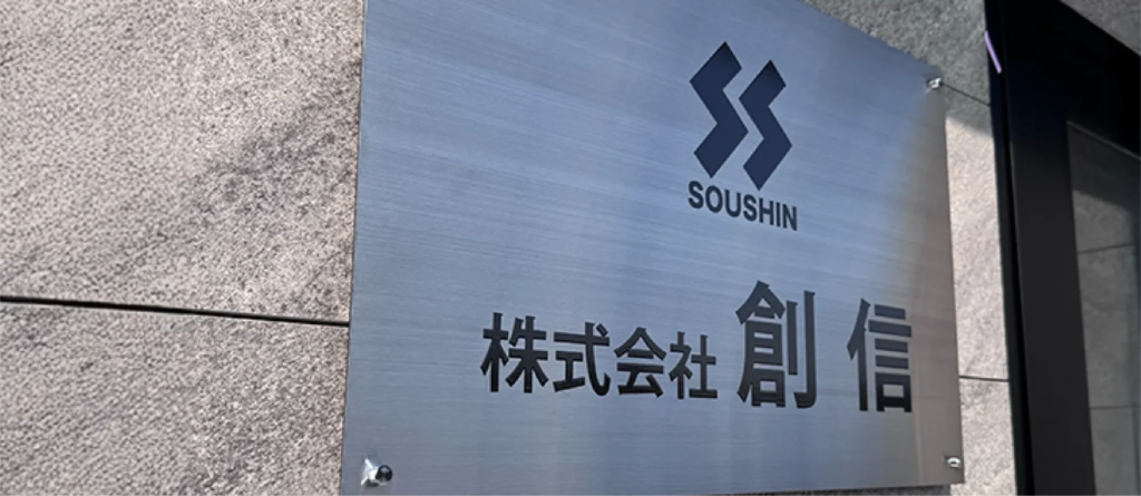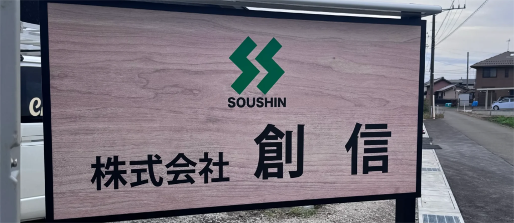 岐阜県岐阜市を拠点に建設事業されている株式会社 創信様の 看板デザインや、野立て看板、証明看板、壁面看板、ルームステッカー等を製作させていただきました。