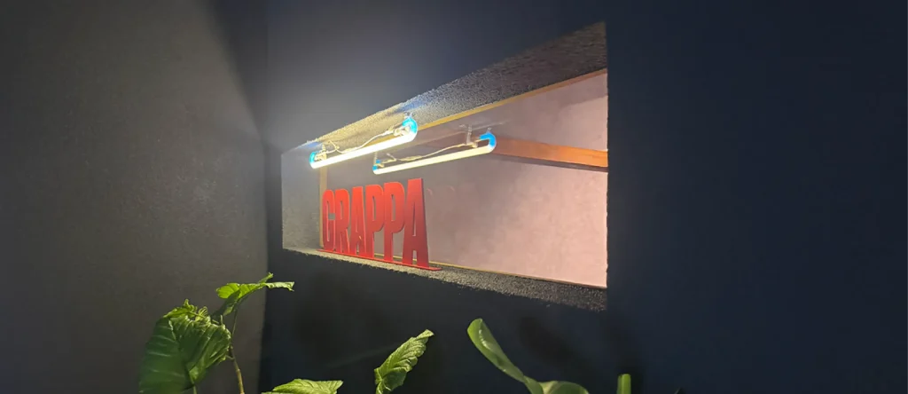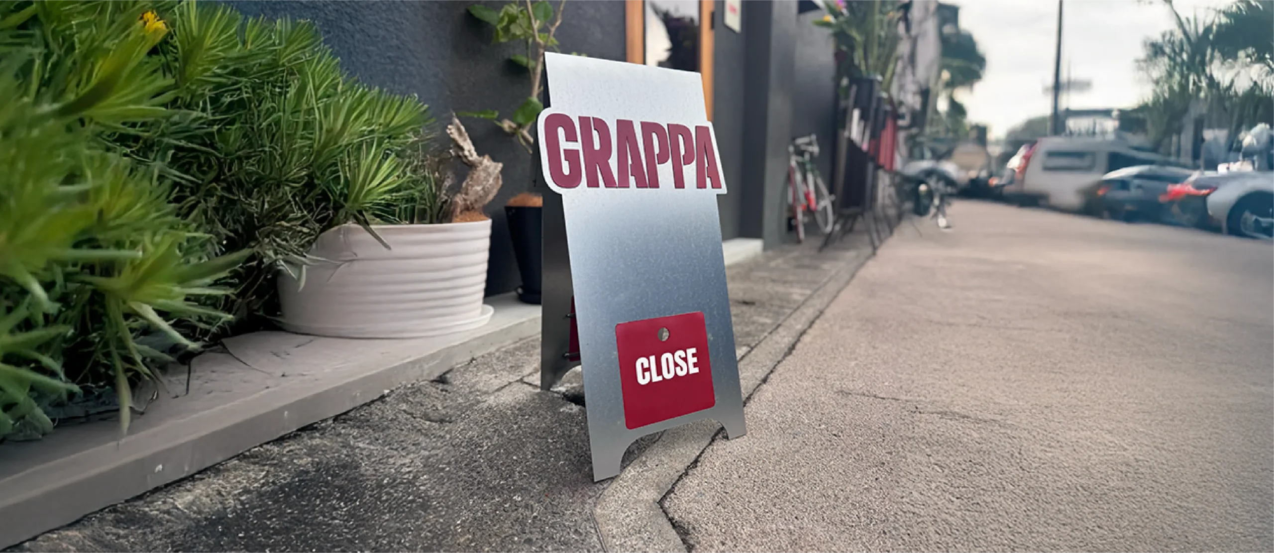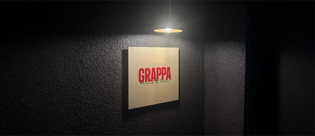 岐阜県岐阜市で飲食店を営まれているgrappa様のブランディングに関わるデザイン制作を担当させていただきました。 ステンレス切り文字看板をはじめ、A看板、メニュー表、チラシなどの制作を担当し、ネオン管を照明代わりに使用して切り文字をぼんやりと照らす仕様の看板デザインにより、店舗の世界観やコンセプトを大切にしたデザインに仕上げさせていただきました。