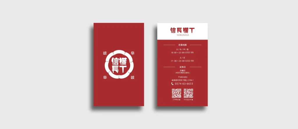 岐阜県可児市を拠点に、飲食業界をしている信長横丁 様の店舗・企業ブランディングに関わるデザイン制作させていただきました。 ロゴデザインをはじめ、ユニホーム、看板、暖簾、のぼり、メニュー表、名刺、ショップカードなどを制作させていただき、ブランドの世界観や統一感を大切にしたデザインに仕上げさせていただきました。