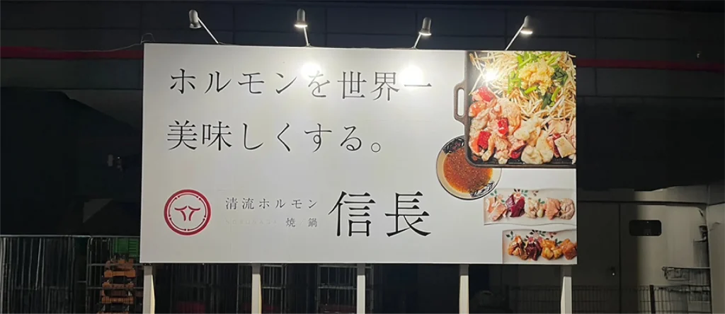岐阜県で飲食事業を展開されている清流ホルモン信長 様のブランディングを軸に、ロゴデザイン、メニュー表、ショップカード、サイン、ユニホーム、提灯、暖簾、Webサイト(HP)、アクリルキーホルダーや肉札、オリジナルグラスなどのお土産販売用グッズを含め、トータルで制作させていただきました。